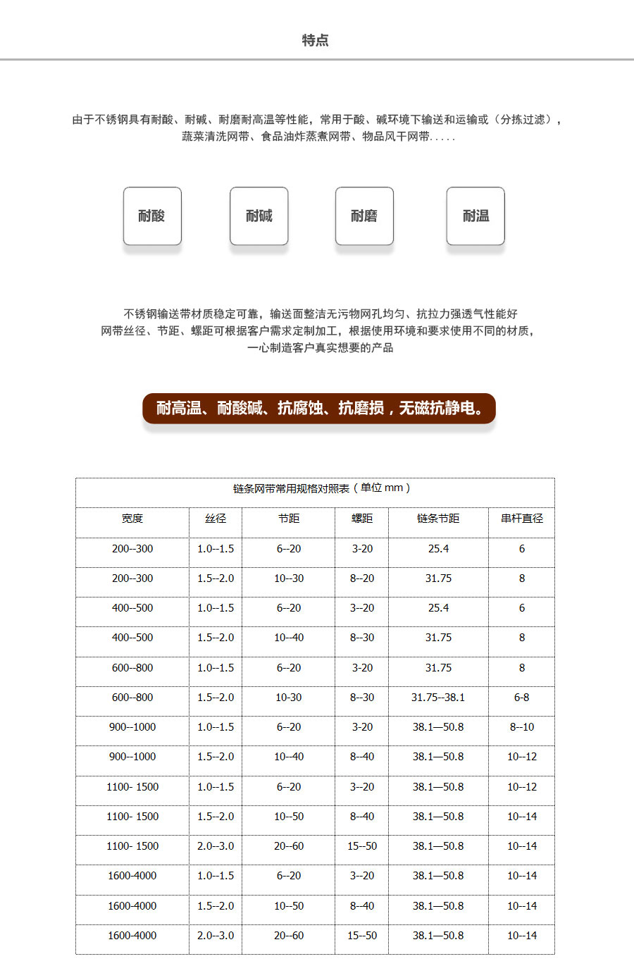 這種鏈桿式網帶采用鏈條傳動,適用于大型和重型傳送,其運動平穩、力量大,網面相對受力小,能對輸送網面起到保護作用,成本較貴,但使用壽命長。大開孔或者小開孔網條;溫度范圍零下55攝氏度到1150攝氏度;邊緣擋板和橫向擋板。