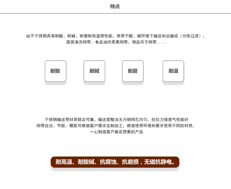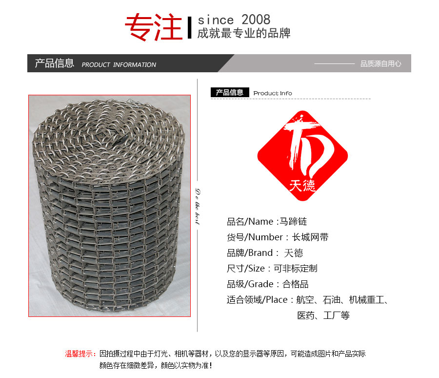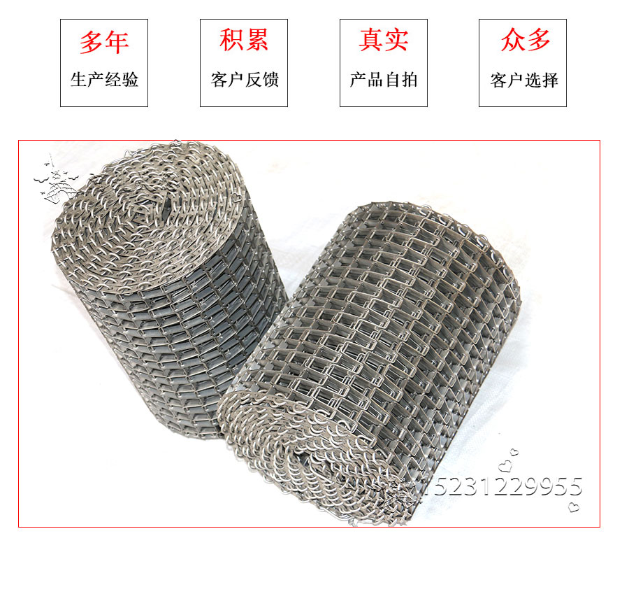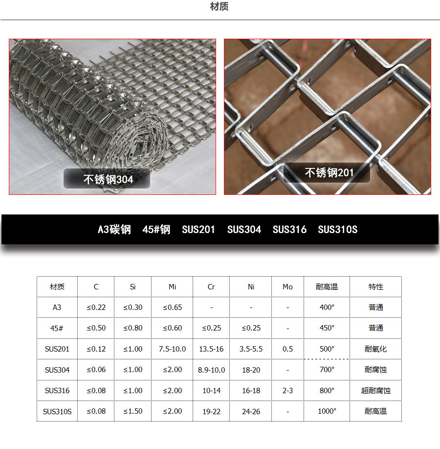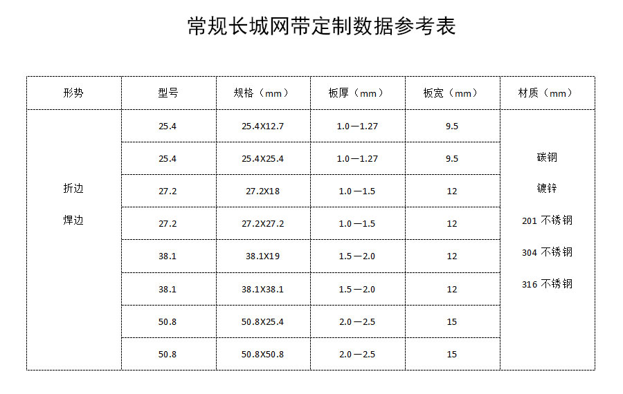 長(zhǎng)城網(wǎng)帶材質(zhì):有A3低碳鋼、45#鋼、1Cr13耐熱鋼、 不銹鋼、304不銹鋼、1Cr18Ni9Ti不銹鋼、0Cr18Ni14NO2CU2耐熱耐酸鋼等
