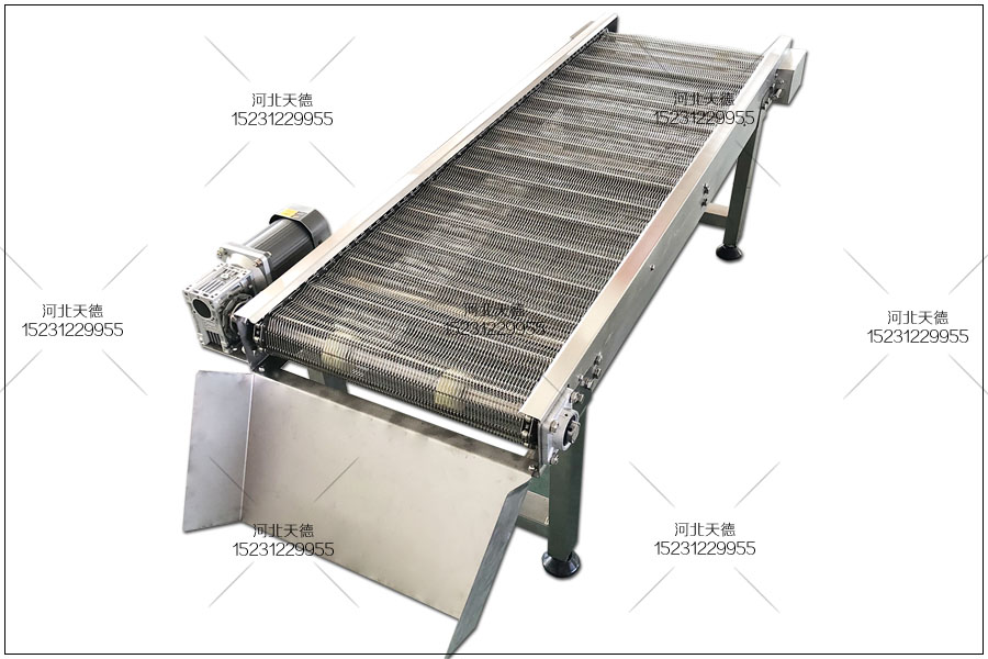 輸送帶的材質(zhì)采用不銹鋼材質(zhì),鋼絲采用1.2毫米直徑進(jìn)行雙旋編織,孔為10*15毫米,鏈條節(jié)距為31.75毫米,鏈桿直徑為6毫米,桿之間的距離為3節(jié)一根。